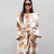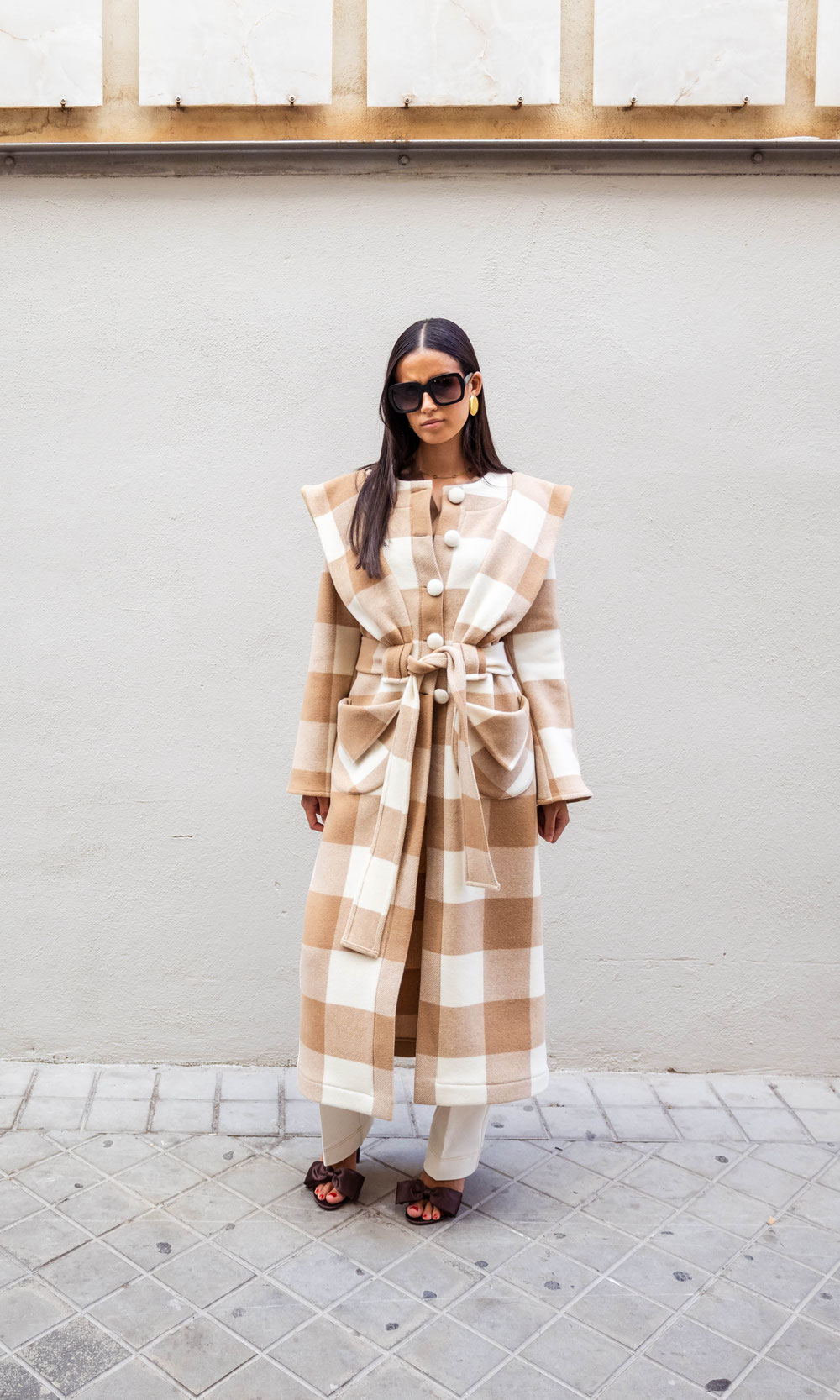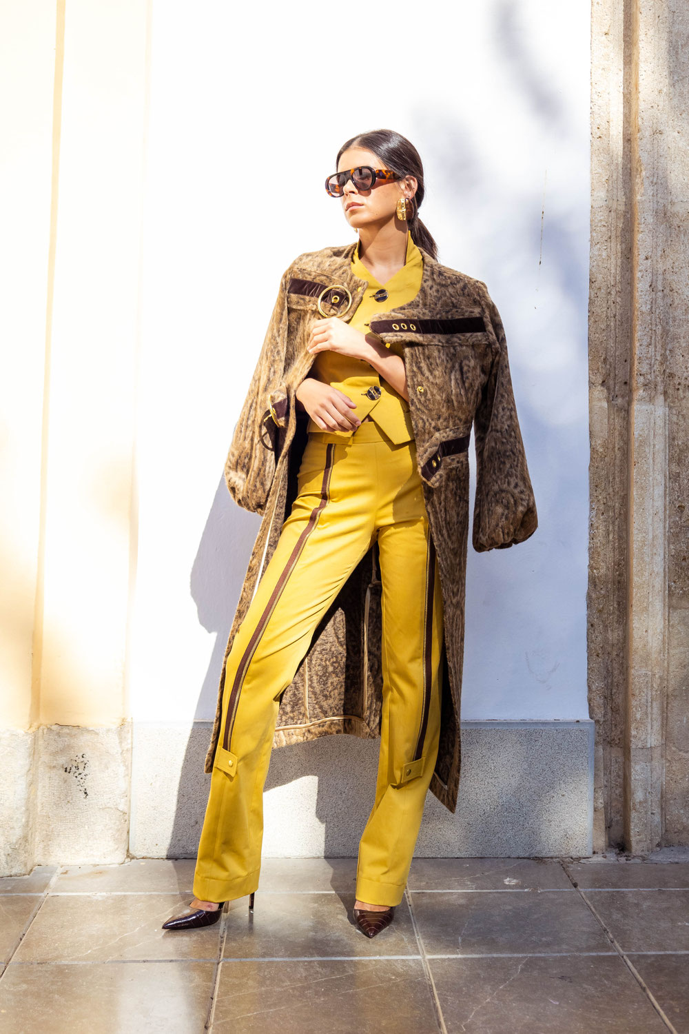 Abrigo de lana de pelo largo, con estampado de cashmere, como detalle cierres con hebillas doradas y aplique en terciopelo.