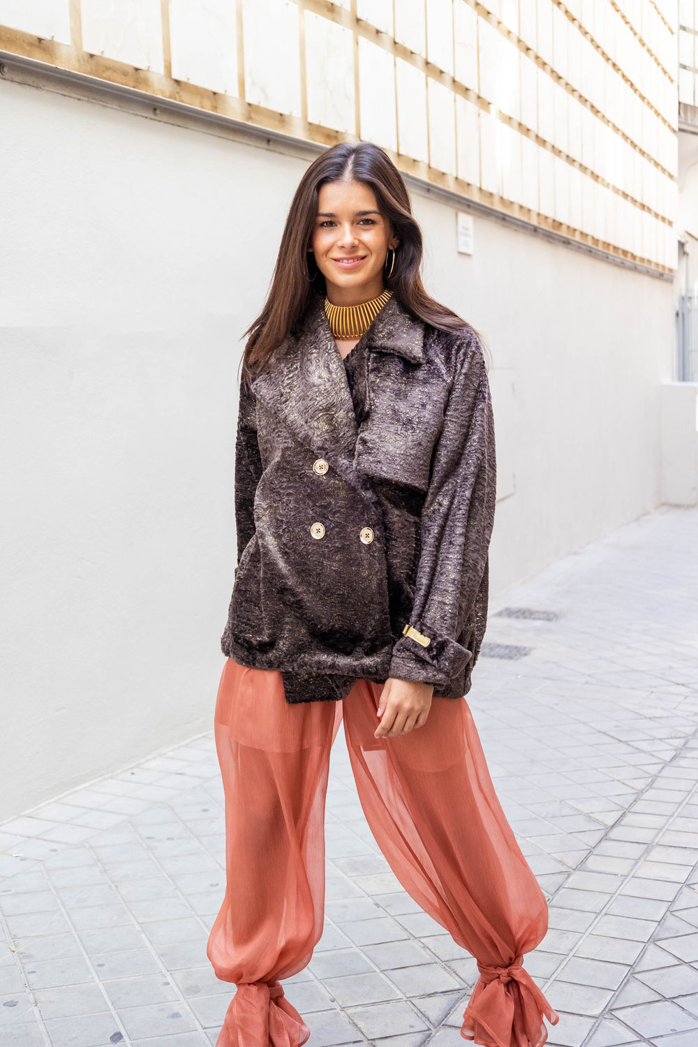 Bomber confeccionada en terciopelo con acabado astracán. Cruce doble con botones grandes dorados.