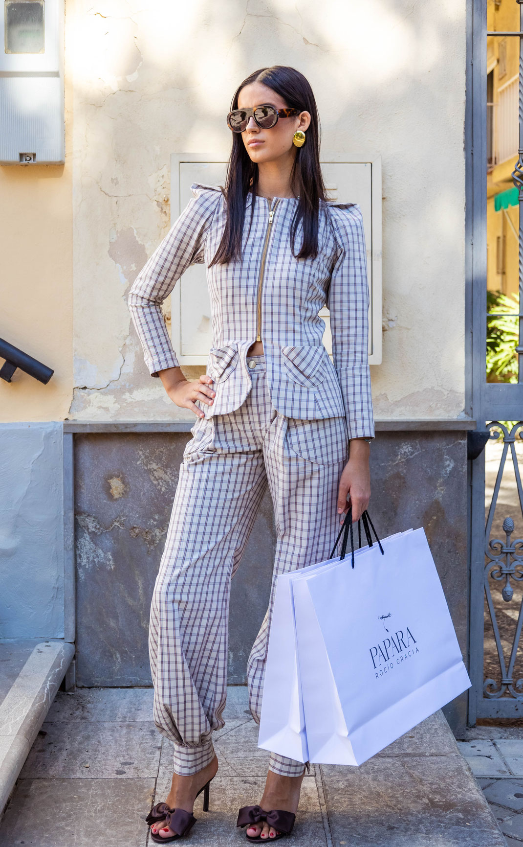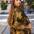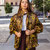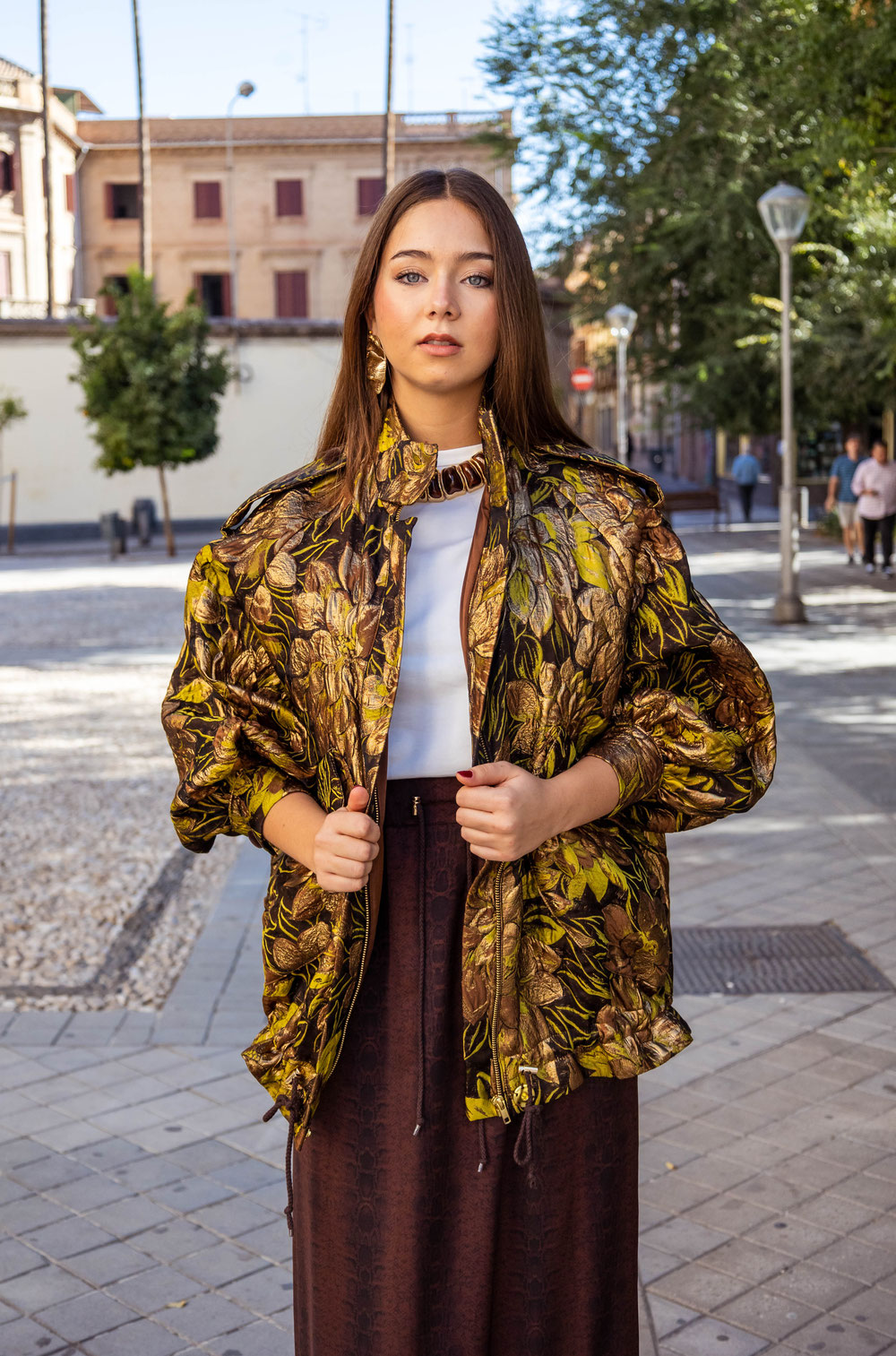 Bomber oversize, confeccionada en cloqué de seda estampado en flores dorados y verdosos. En el interior forrada, con cremallera métalica. se puede ajustar en la cintura. Como detalle maxi bolsillos.
