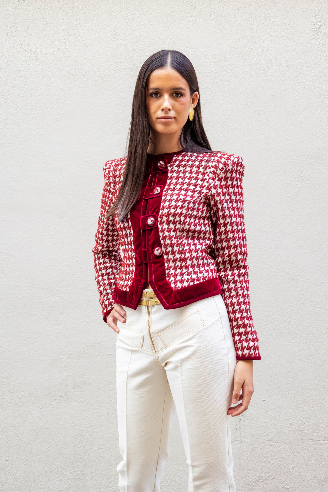Chaqueta torera con detalles en terciopelo  en color burdeos, interior forrado.