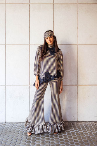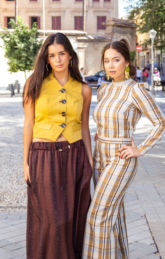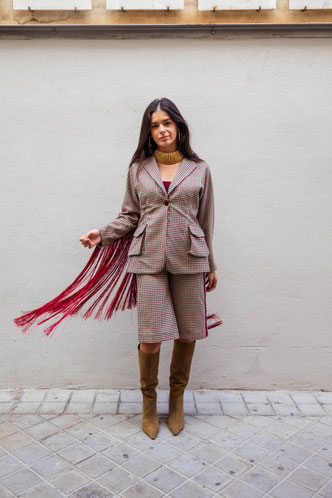 Falda pantalón confeccionado en cuadros de macadamia, con detalle de terciopelo en los costados y bolsillos metidos en costura.